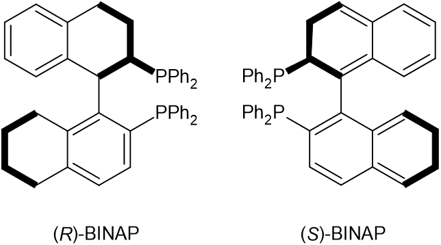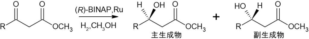ルテニウムRuといった遷移金属と錯形成した(R)-BINAP錯体を触媒として、以下のようなβ-ケトエステルを水素還元すると、-OH基が手前に出た構造が主生成物として選択的に合成されました。