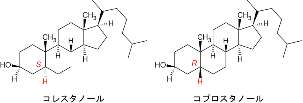 他にも複数のキラル中心を持ち、1か所のみキラル中心が異なった化合物をエピマーといいます。有名なのがα-グルコースとβ-グルコースです。他にも人の排泄物に含まれるコレスタノールとコプロスタノールは9個のキラル中心を持っており、1か所のみ違います。これもエピマーですね。