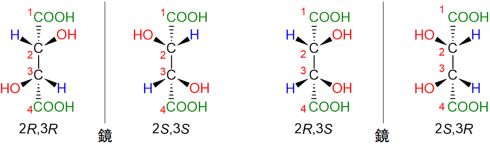 次に2か所キラル中心を持った酒石酸について見ていきましょう。酒石酸は二つのキラル中心を持っています。つまり、2R,3R体、2S,3S体、2R,3S体、および2S,3R体の合計4つの立体異性体を持っており、2R,3R体、2S,3S体同士と2S,3S体、2R,3S体同士がエナンチオマーとなります。