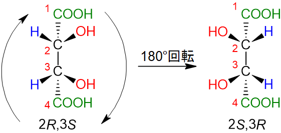 勘の良い人はお気づきになったかもしれませんが、2R,3S体と2S,3R体は実は同じです。2R,3S体を180°回転させると2S,3R体になります。