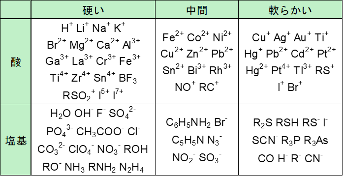 また、HSAB則の具体例として、以下の表にまとめました。