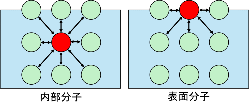 上図からわかる通り、内部分子は全面的から相互作用が働くため、全体的に相殺され相互作用は0となります。