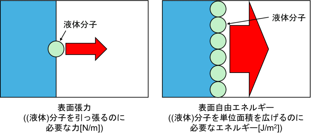 ここまで説明しておいて、ネタばらしになりますが、液体において、表面張力と表面自由エネルギーは同じです(上述の通り、表面張力を議論できるのは液体のみのため)。