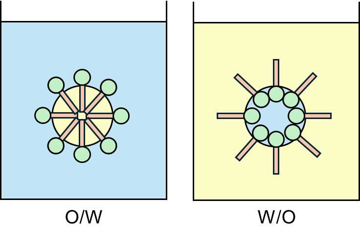 ちなみに、今まで水が分散媒、油が分散質、O/W(Oil in Water)を解説してきましたが、逆もあります。つまり、W/O(Water in Oil)もあるということです。例えるとドライクリーニングです。ドライという言葉がある様に、水を使わず有機溶剤、つまり油を用いて油汚れを落とします。しかし、有機溶剤では親水性の汚れは落ちません。そのため、界面活性剤を用いて親水性汚れを落としています。O/W、W/Oの形状を以下に図示しますが、要は界面活性剤の配向の向きが逆になっているだけです。