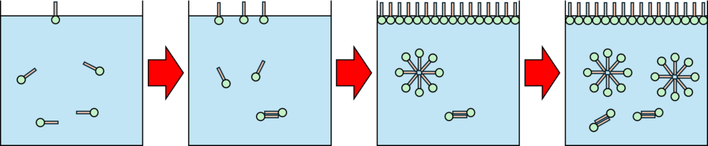 模式図を以下に示しました。始めは界面に配向し、単分子層を形成します。単分子層形成後は会合してミセルを形成していきます。この時、ミセルが急激に増加する濃度域があります。この濃度域を臨界ミセル濃度(CMC,Critical Micelle Concentration)といいます。ちなみに濃度です。中和みたいに一点ではないですよ。