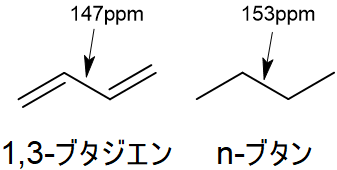 ここでよく例にとられるのが1,3-ブタジエンです。二重結合の無いn-ブタンと比較すると、二重結合はもちろん、中央に存在するC-C単結合もn-ブタンより安定しています。実際、1,3-ブタジエンの単結合距離は147ppmなのに対し、ブタンの単結合は153ppmと、前者の方が6ppm短いです。つまり、前者の方が強力な結合で安定しています。