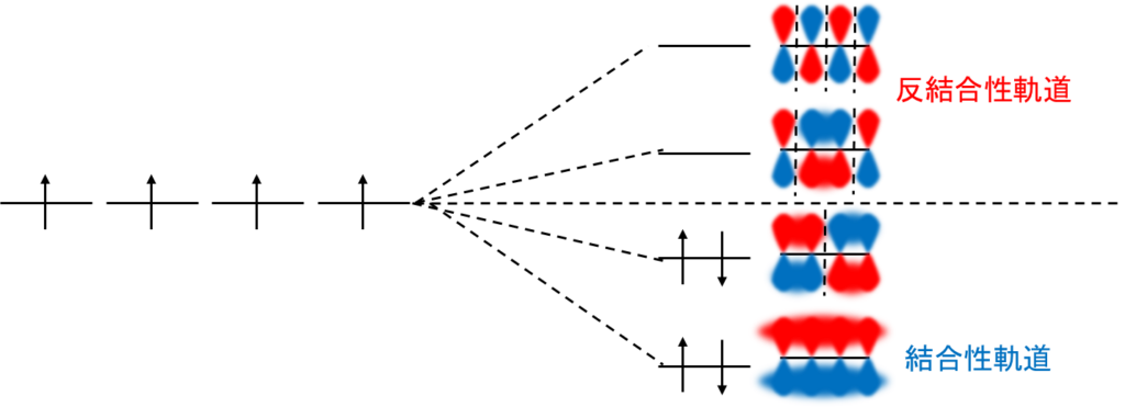 1,3-ブタジエンのp軌道のみの分子軌道法は以下の通りです。芳香族の時と同様、π電子が結合性軌道にスッポリ収容されます。