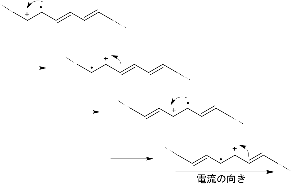 上図でいうと、カチオンは右に、π電子は左に移動しています。電子の移動、つまり電流が発生したということです。正電荷の動く方向が電流であるため、上図では電流の向きは右方向となります。