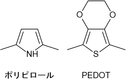 以上が、ポリアセチレンですが、他にも導電性プラスチックはあります。ポリピロール、PEDOTです。構造式を以下に示します。