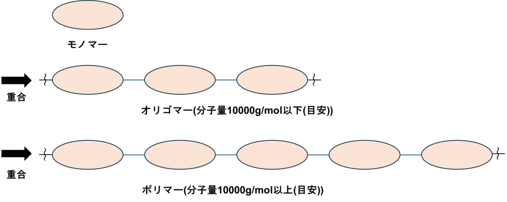 それにより出来上がった物質をオリゴマー、ポリマーと呼びます。オリゴマーは比較的分子量の小さい分子である一方、ポリマーは比較的分子量の大きい分子です。特に定義は無いためオリゴマーとポリマーの境界線は無いのですが、目安としては分子量10000g/molより低いとオリゴマー、それ以上だとポリマーと呼ばれています。あくまで目安です。定義ではありませんよ💦図示すると以下の通りです。