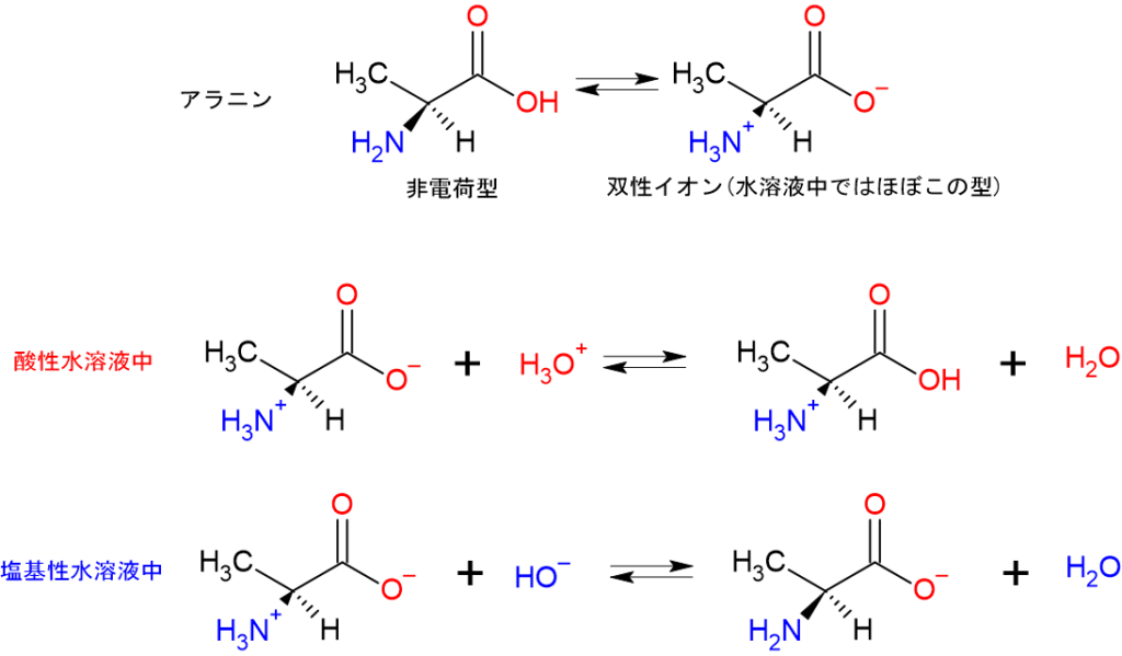 また、酸性水溶液中では水素イオンH+が多いためカルボニルイオンにくっつき-NH3+、ーCOOHという形に、逆に塩基性水溶液中では水酸化物イオンOH–がアンモニウムイオンから水素イオンH+を引っこ抜くため-NH2、ーCOO–という形になります。