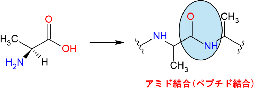 それはずばり、アミド結合、生物用語で言うとペプチド結合です。主にカルボン酸とアミド基が脱水縮合して結合しています。先程のアラニンを例にとると以下の通りです(ここでは非電荷型で記載します)。