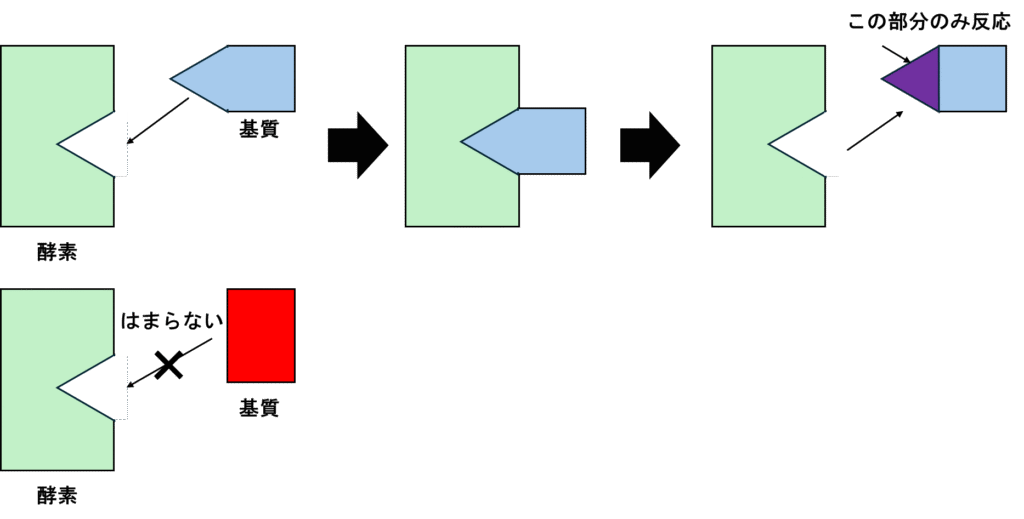 ただ、普通の触媒とは何が違うのか?それは基質特異性です。基質特異性とはとある基質の特定部位のみにしか反応しない、選択的に反応を起こすことです。よく鍵穴を例にとられます。鍵穴に上手くはまる基質のみ反応が起こり、はまらない基質は反応しません。
