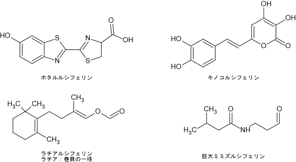 ホタル、キノコ等光る生物は上記のルシフェリンをルシフェラーゼという酵素により生合成される際に光を放ちます。