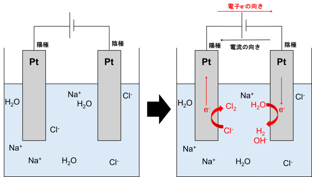 陰極では塩基での水の電気分解同様、H2Oが還元されてH2とOH–が生成されます。そして陽極ではCl–が酸化されてCl2が発生します。