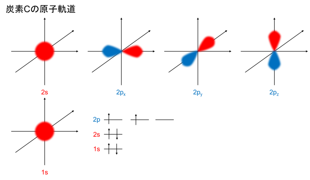 炭素はK殻に2つの電子、L殻に4つの電子があります。つまり、炭素は[C](1s)2(2s)2(2p)2と表記します。p軌道は3つ存在しますが、それぞれ、x,y,z軸の様に直交して存在します。原子軌道は以下の通りです。