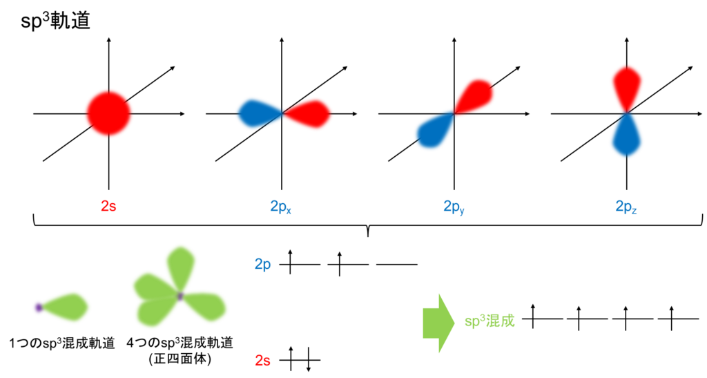 じゃあ上図の原子軌道は間違いじゃないかって? そこで登場するのが混成軌道です。