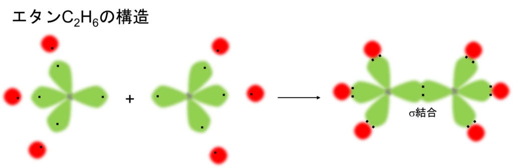 ちなみに、エタンC2H6はそれぞれ2つの炭素Cに6つの水素Hがくっつき、余ったsp3混成軌道同士でσ結合を形成します。