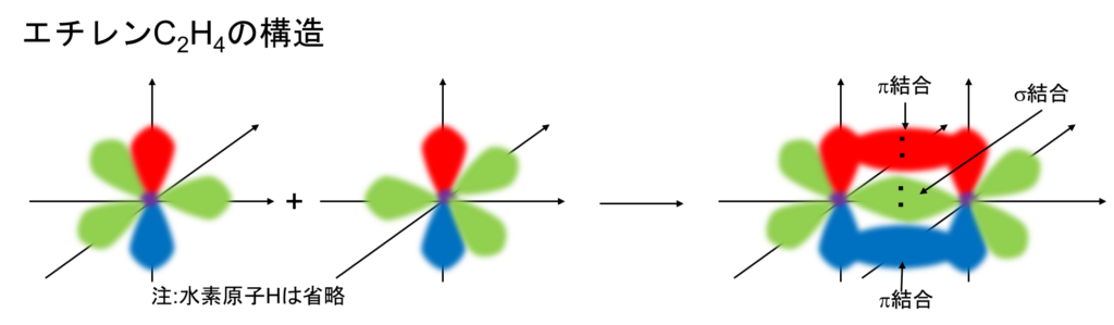 ここで、エチレンH2C=CH2の構造を紹介します。混成軌道には水素原子、ないし混成軌道同士がσ結合をします。ここまではエタンと同様です。しかし、直接ではなく側面に合わさったp軌道の電子同士が重なり合い結合を形成します。これをπ(パイ)結合と呼び、またこの時の電子をπ電子と呼びます。円周率のπとごっちゃにならないように笑