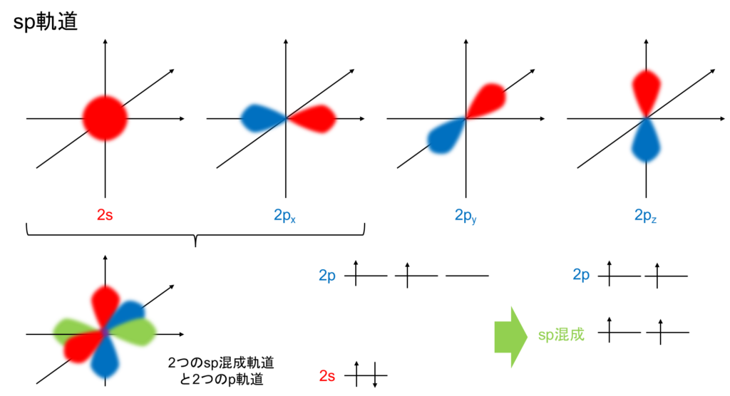 エネルギー順位としては2つのsp混成軌道に加え、2つのp軌道が上部に残り、電子もそれぞれ1つずつ割り振られています。構造も1つの混成軌道に2つのp軌道が直交して存在します。