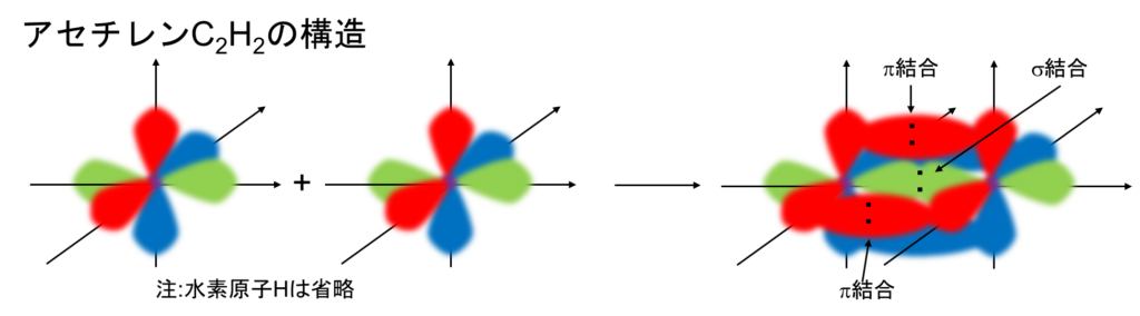 ここでアセチレンHC≡CHの構造を紹介します。もうお分かりだと思いますが、C≡C結合は混成軌道同士で1つのσ結合、p軌道同士で2つのπ結合が形成されます。