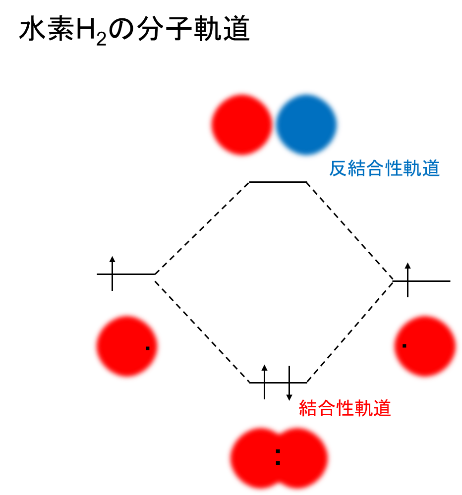 水素分子H2で簡単に解説すると、同じ位相の1s軌道同士で結合し元の原子軌道よりエネルギー順位が低い軌道を結合性軌道、逆に違う位相の1s同士が反発し合い元の原子軌道よりエネルギー順位が高い軌道を反結合性軌道と言います。